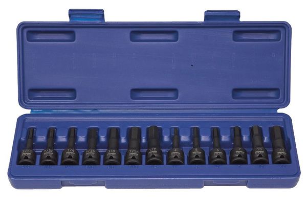 $89.49 / eachWeb price13-Piece Impact Bit Socket Set, 3/8 in Drive, SAE/Metric, Hex Tip Type, Black OxideSKU G1870967CategoriesDescription Impact Socket Bit Set, Metric, SAE, Tip Size 1/2 in, 1/4 in, 3/16 in, 3/8 in, 5/16 in, 7/16 in, 7/32 in, H04, H05, H06, H07, H10, H12, Drive Size 3/8 in, Alloy Steel, Black Oxide, Number of Pieces 13, Overall Length 2 23/64 in, Replaceable Insert No, Socket Depth Standard, Tip Style Hex, Impact Rated Yes, Magnetized Tip NograingerSKU: 4PRG1, mscSKU: , zoro_no: G1870967, mongo_id: 65bbe9ad22d7a989a996d2d3