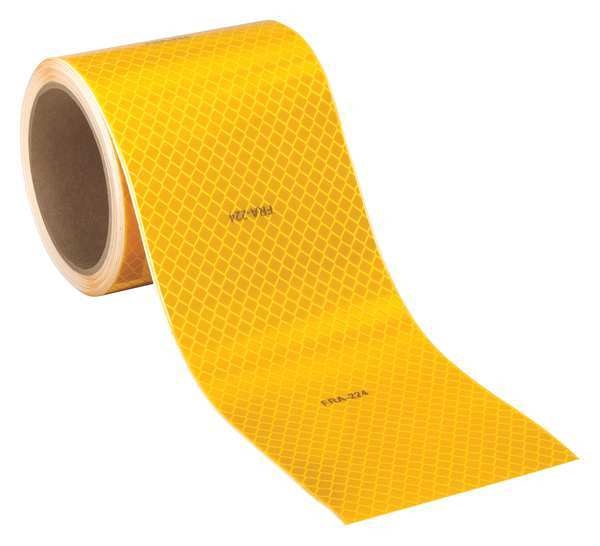 Description Reflective Tape, Reflective Color Fluorescent Yellow, Width 4 in, Length 50 yd, Adhesive Material Acrylic, Backing Material Retroreflective Microprismatic Material, Thickness 16 mil, Adhesion Strength 2.5 lb/in (FRP), 3.0 lb/in (Tedlar(R)), 3.0 lb/in (Prepainted Panel), 3.5 lb/in (Aluminum Rail), 5.3 lb/in (Degreased Aluminum), 6.0 lb/in (Stainless Steel), Outdoor