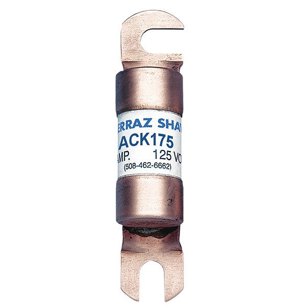 Description Forklift Limiter Fuse, 175 A, 125V AC, 125V DC, ACK Series, Nonindicating, Time Delay, Body Style Bolt-On, Nonrejection, Interrupt Rating 10kA at 125 V DC, 10kA at 125V AC, Fuse Size 4-3/4 in L x 1-1/8 in dia, Length 4 3/4 in, Width Not Applicable, Depth Not Applicable, Diameter 1 1/8 in, Equivalent Brand and Series Littelfuse CCK, Mersen ACK, Equivalent Series ACK, CCK, Body Material Poly Tube, Dual Element, Standards UL file E60314, UL Recognized Component