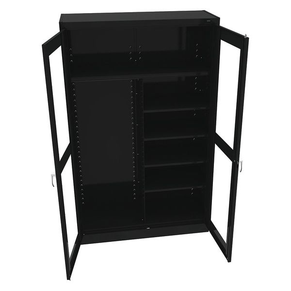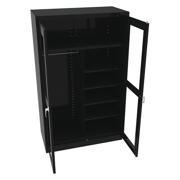 SKU G9837825CategoriesDescription Storage Cabinet, Base Type Leveling, Body Panel Type Solid, Cabinet Color Black, Cabinet Material Steel, Cabinet Storage Components Hanging Rods, Shelves, Door Handle Type Swing, Door Type Clearview, Duty Rating Medium Duty, For Use Indoors/Outdoors No, Frame Assembled Unassembled, Load Capacity per Shelf 400 lb, Lock Type Keyed, Mobility Stationary, Mounting Location Freestanding, Number of Shelves 5, Overall Depth 18 in, Overall Height 78 in, Overall Width 48 in, Audit Trail Storage NonegraingerSKU: 9MH22, mscSKU: , zoro_no: G9837825, mongo_id: 65bbe69e3aaddbd5a903f58e