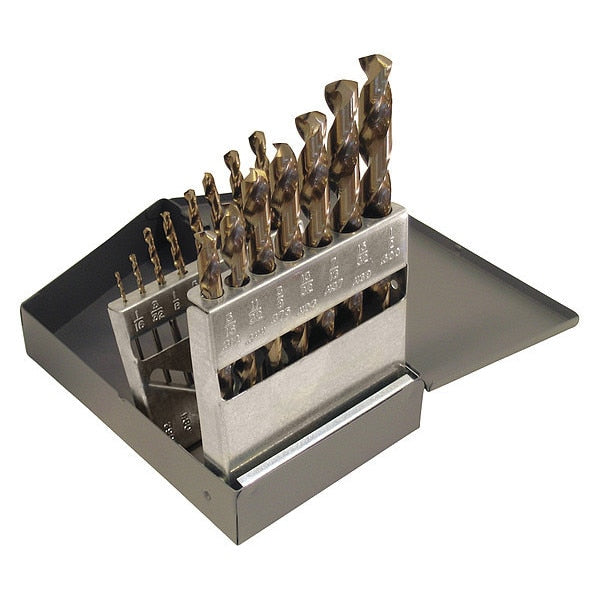 Description Jobber Drill Bit Set, Number of Drill Bits 15, Drill Bit Point Angle 135 Degrees , Material - Machining Cobalt, Finish - Machining Straw/Bronze