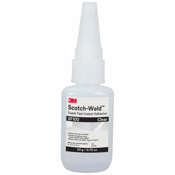 $30.81 / eachWeb priceSuper Fast Instant Adhesive, Scotch-Weld Instant Adhesives Series, Clear, 0.71 oz, BottleSKU G806170904Categories Adhesives, Epoxy & SealantsDescription Super Fast Instant Adhesive, Adhesive Color Clear, Container Size 0.71 fl oz, Container Type Bottle, Cure Method Humidity, Maximum Viscosity 100 cps, Minimum Viscosity 20 cps, Series SF100, Built-in Dispenser Type Dropper, Features Low Viscosity Adhesive, Precise Dropping Application, Strong Bond, Materials Bonded Cardboard, Ceramic, Cork, Fabric, Felt, Foam, Glass, Leather, Metal, Paper, Plastic, Rubber, WoodgraingerSKU: 796UL6, mscSKU: , zoro_no: G806170904, mongo_id: 65bbe8e222d7a989a9920849