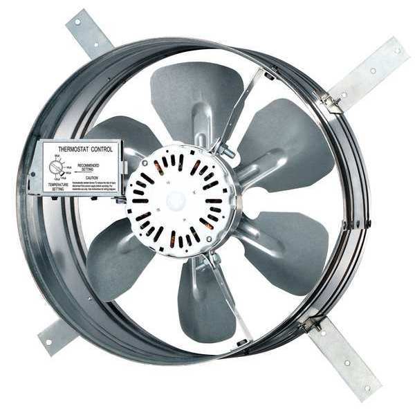 Description Attic Exhaust Fan, Control Type Thermostat, Blade Material Steel, Exhaust Airflow @ 0.000 in SP 1,140 cfm, Fire Safety Shut-Off No, High-Efficiency Motor No, Housing Material Steel, Includes Humidistat No, Includes Shutter No, Includes Thermostat Yes, Maximum Attic Area 1,630 sq ft, Motor Horsepower 1/16 hp, Mounting Location Gable, Nameplate Voltage 120V AC, Overall Diameter 15 in, Overall Height 8 in, Overall Length 15 in, Overall Width 15 in, Dome Shape Not Applicable