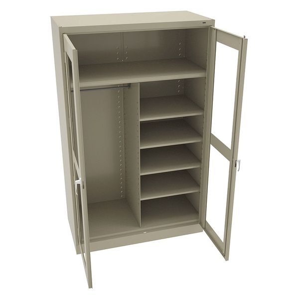 SKU G2121239CategoriesDescription Storage Cabinet, Base Type Leveling, Body Panel Type Solid, Cabinet Color Sand, Cabinet Material Steel, Cabinet Storage Components Hanging Rods, Shelves, Door Handle Type Swing, Door Type Clearview, Duty Rating Medium Duty, For Use Indoors/Outdoors No, Frame Assembled Unassembled, Load Capacity per Shelf 400 lb, Lock Type Keyed, Mobility Stationary, Mounting Location Freestanding, Number of Shelves 5, Overall Depth 24 in, Overall Height 78 in, Overall Width 48 in, Audit Trail Storage NonegraingerSKU: , mscSKU: , zoro_no: G2121239, mongo_id: 65bbe6143aaddbd5a900621c