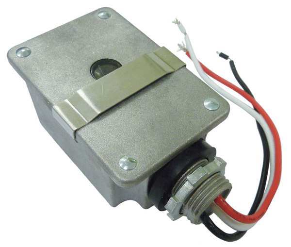 Description Photocontrol, Mounting 1/2 in Conduit, Flush, Voltage 120V AC, Max. Wattage 2,000, Max. Incandescent Amps 16.7 A, Max. Ballast Amps 16.7 A, 10.0 to 20.0 Foot Candles On, 30 to 60 Foot Candles Off, Color Gray, Temp. Range -40 Degrees to 158 Degrees F, Length 3 in, Width 2 in, Depth 1 1/2 in, Enclosure Type Raintight, Contact Form SPST, Housing Material Die-Cast Aluminum, Setting Dusk to Dawn, Standards UL, Includes Lock Nut, Washer Gasket
