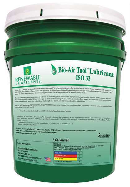 Biodegradable Air Tool Oil, 5 gal.SKU G4621951Categories Air ToolsDescription Air Tool Lubricant, ISO Viscosity Grade 203, SAE Grade Not Specified, Base Oil Synthetic, Container Size 5 gal, Container Type Pail, NSF Rating Not Rated, Min. Operating Temp. -17 Degrees F, Max. Operating Temp. 250 Degrees F, Viscosity Index 203, Flash Point 446 Degrees F, Pour Point -22 Degrees F, Color Yellow, Timken OK Load Not Specified, ASTM D-5864, EAL, EPA, OSHA Hazard Communication Standard 29 CFR 1910.1200, VGPgraingerSKU: 21A502, mscSKU: 62685383, zoro_no: G4621951, mongo_id: 65bbe9bf22d7a989a9975262