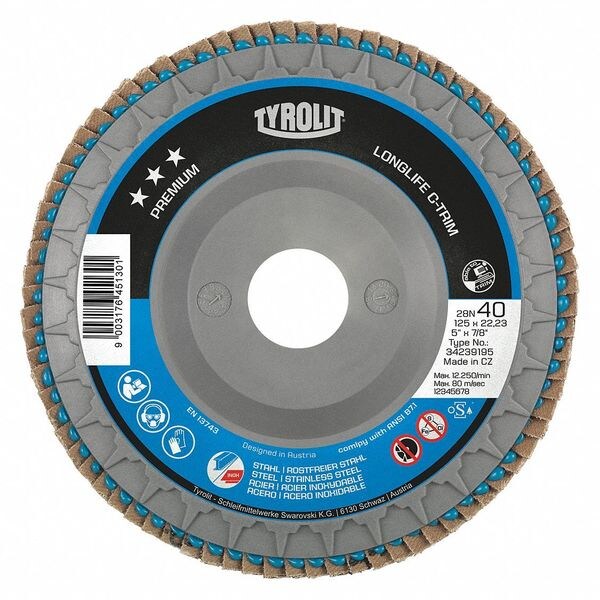 Flap Disc, T27N, 4.5"x5/8"-11, 40 Grit, PK5, Abrasive Material: Zirconia Alumina