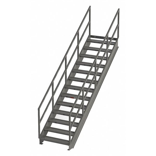 Industrial Stairway, 13 Steps, 98" Rise, 123.5" Run, 36"W Serrated TreadSKU G3328066Categories Antislip Tapes, Treads & Stair NosingsDescription Stair Unit, Material Carbon Steel, Number of Steps 14, Handrails Included Yes, Load Capacity 1,000 lb, Climbing Angle 36 Degrees , Step Tread Serrated, Step Width 36 in, Step Depth 9 1/2 in, Base Depth 123 1/2 in, Overall Height 98 in, Color Gray, Standards OSHA, Overall Width 39 in$3,113.99 / eachWeb price -