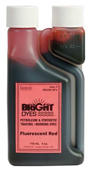 Leak Detection Dye, Red Fluorescent, 4 ozSKU G5131691CategoriesDescription Dye Tracer Liquid, Dye Type Water Tracing Dye, Color Red, Form Liquid, Container Size 4 oz, Coverage 100 to 200 gallons per ounce of dye, Dissolution Time Immediate, Detectability 5 ppm, Fluorescent Yes, Application Fats, Provides Leak Detection and Color Coding for Oils, Resins and Most Solvents, Synthetic Oils, WaxesgraingerSKU: 45H151, mscSKU: , zoro_no: G5131691, mongo_id: 65bbe7ee22d7a989a98ca4c5