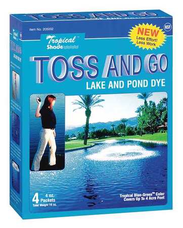 Pond Dye Bag, Blue, Pk4SKU G4066036CategoriesDescription Pond Dye Bag, For Use In Lakes, Ponds, Treatment Coverage 312,500 gal, Container Type Bag, Container Size 4 oz, Dye Color Blue, Form Powder, Standards ANSI; NSF, Package Quantity 4graingerSKU: 9MFP3, mscSKU: , zoro_no: G4066036, mongo_id: 65bbe89622d7a989a9902a85